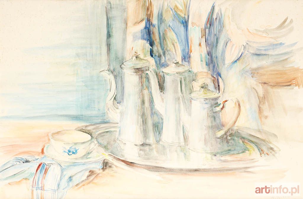 akwarela, ołówek, papier; 39 x 58 cm w świetle passe-partout sygn. p.d. A.Milich Na odwrocie nalepka: MUSEE GALLIERA PARIS/ Milich-Simon-Levy-Gimond/ 1957-1958/ Les Cafetieres, nr kat.79