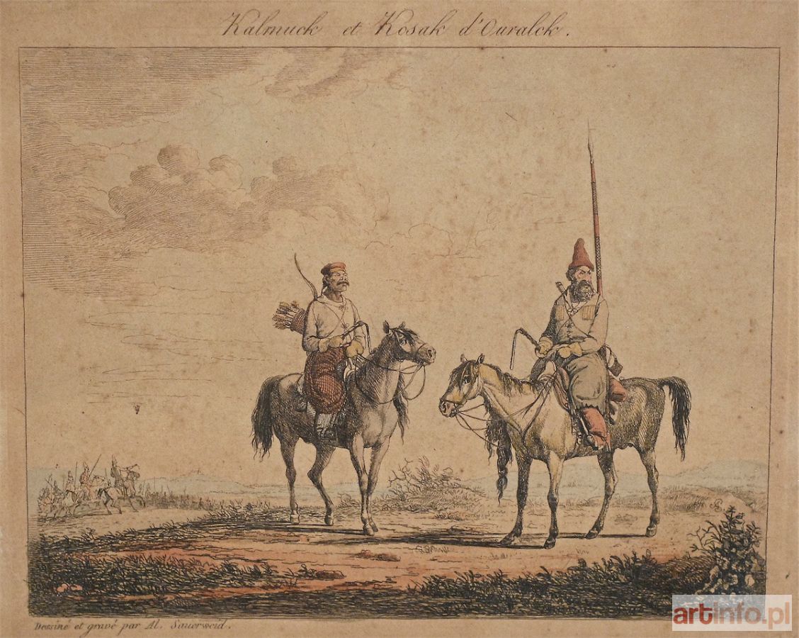 akwaforta kolorowana, 15,1 x 18,3 cm, sygn. na płycie l.d.: Dessiné et gravé par Al. Sauerweid.; monogramem wiązanym na płycie p.d.: AS; wzdłuż górnej krawędzi tytuł: Kalmuck et Kosak d`Ouralck.