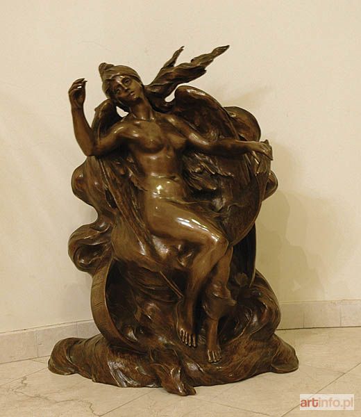Okazała rzeźba przyścienna - z ok. 1900 r. - przedstawiająca nagą, uskrzydloną kobietę - alegorię Natchnienia - trzymającą rylec i arkusze.