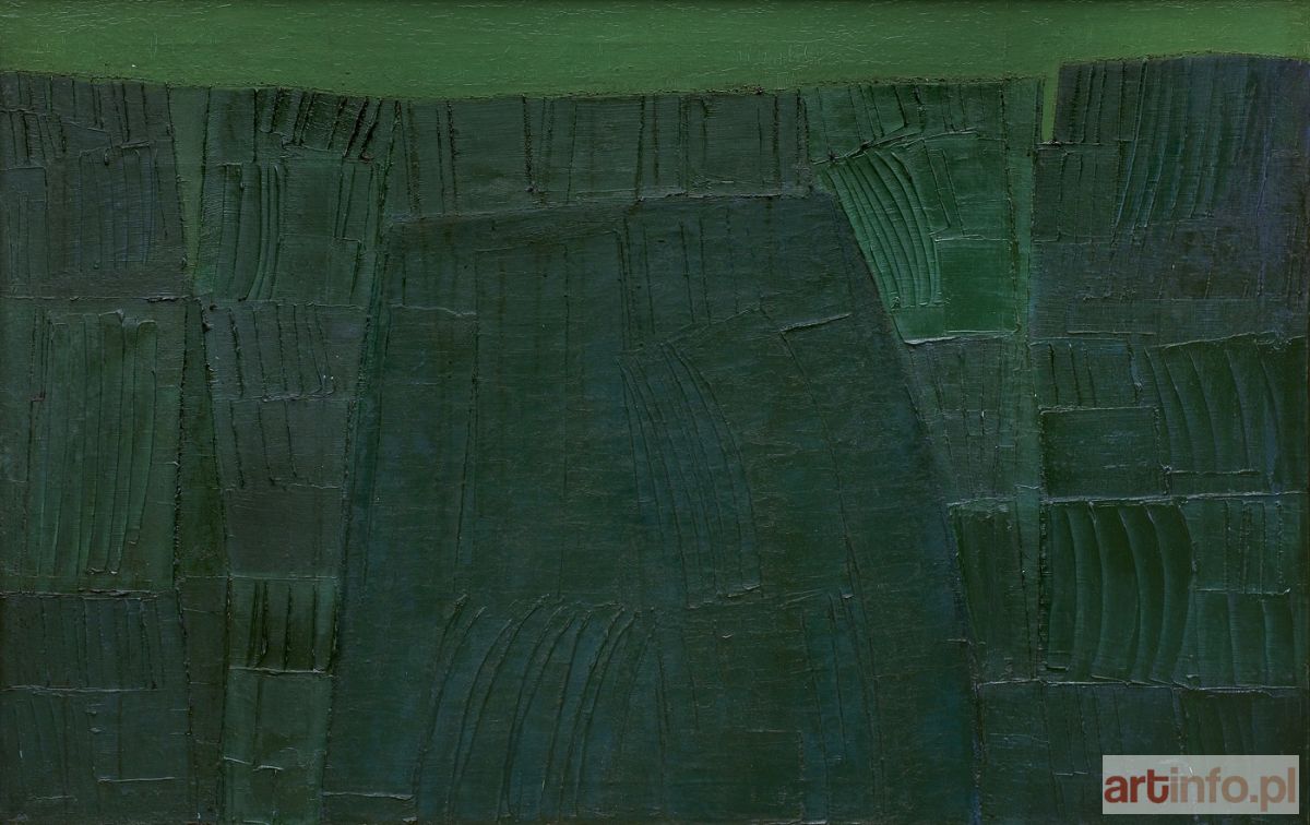 olej, płótno 73 x 116 cm na odwrocie na krośnie w narożniku nalepka: BWA | ATEST Nr. 1/AM/82, poz. 13 | ALFONS MAZURKIEWICZ | NISKIE ŁĄKI /1962/ | olej pł., 73 x 116 cm, niesygnowany | Katalog - Wrocław 1976 poz. 92 | WROCŁAW po lewej okrągła pieczątka z podpisem dyrektora; na g. krośnie uszkodzona nalepka informacyjna