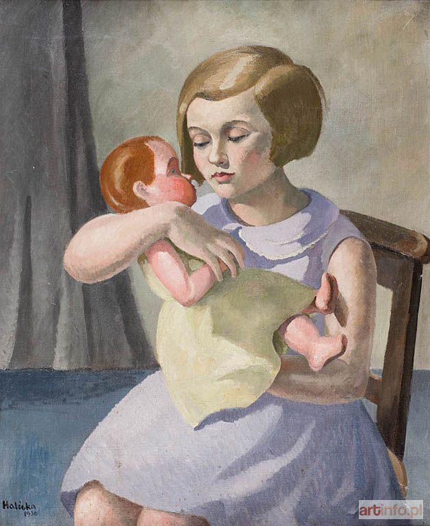 O obrazach malowanych przez Alicję Halicką po 1927 roku krytyk Edward Woroniecki napisał, że są to "prawdziwe symfonie ulotnych bieli, błękitów i delikatnych zieleni lub bladego oranżu". W innych fragmentach wspominał "wykwintne gamy bieli i błękitu". Do tej grupy zaliczany jest oferowany obraz "Dziewczynka z lalką", malowany realistycznie i światłocieniowo należący do nurtu scen z domowego życia. Doskonale ukazane światło wydobywa rysy twarzy dziewczynki, będącej najprawdopodobniej córką artystki, Maleną. Obraz, przepiękny w swej tematyce i formie malarskiej należy do grupy najlepszych dzieł artystki.