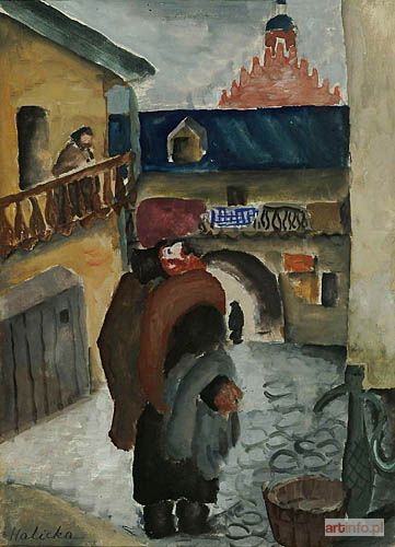 W r. 1921 Halicka odwiedziła Warszawę, Kraków i Zakopane. We wspomnieniach zatytułowanych Wczoraj (Paryż 1946) notuje: "Z podróży po Polsce - gdzie odnajdywałam smutne równiny poprzecinane brzozami, nędzne chaty, baby w kraciastych chustach, Żydów w chałatach, z pejsami i w lisich czapach - przywiozłam serię gwaszów; ich tematem było krakowskie getto, zjawiskowe i tajemnicze. Wystawa tych gwaszy w galerii Berthe Weill, a później w Droueta zwróciła uwagę krytyki. Zakupili je znani kolekcjonierzy..." Jako poz. 23 w katalogu wystawy wymieniony został Marchand d`Habits(z ekspertyzy prof. dr hab. Jerzego Malinowskiego).