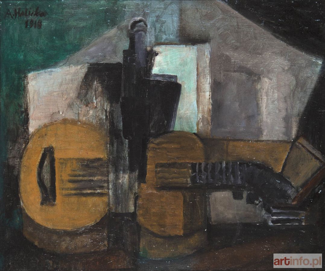Kompozycja kubistyczna z leżącą gitara i kartką papieru