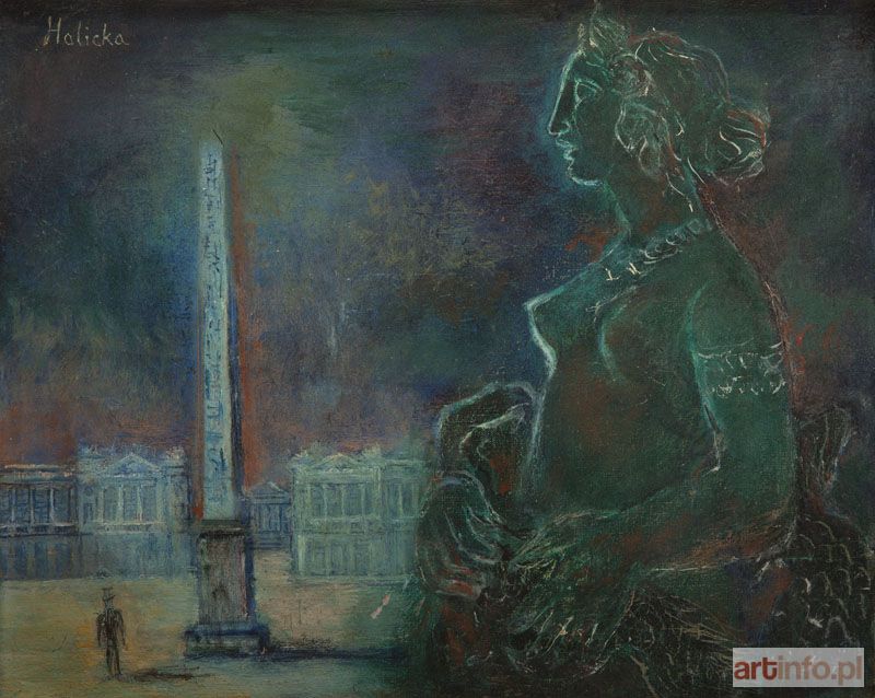 Cykl obrazów ukazujących plac Zgody (Place de la Concorde) powstawał w latach 40., tuż po powrocie artystki do Paryża. Okres wojenny Halicka spędziła poza miastem. Do śmierci swojego męża, Louisa Marcoussisa w 1941 roku, mieszkała razem z nim w Cusset koło Vichy. Następnie przeniosła się do Marsylii, a później do Sallanches w Alpach. Na Montmartre wróciła w 1944. Wtedy prawdopodobnie zaczęła tworzyć obrazy wyobrażające plac Zgody. Część z nich nosi znamiona realizmu; inne, jak np. "Godzina H na Place de la Concorde“, mają charakter wizyjny. Kompozycje z tego cyklu, podobnie jak ta prezentowana w naszym katalogu wykorzystują podobny garnitur motywów. Ukazana na pierwszym planie naga kobieta to rzeźba z fontanny znajdującej się na placu (stworzył ją w 1840 roku Jacques-Ignace Hittorff). W tle widać klasycyzujące gmachy zbudowane w połowie XVIII wieku przez Jacques’a Ange’a Gabriel’a oraz egipski obelisk.