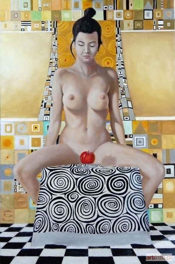 olej/płyta, 92 x 61 cm oprawiony, sygnowany l.d: 'PODULKA | 2018' sygnowany, datowany i opisany na odwrociu: 'AKT Z CZERWONYM JABŁKIEM | Podulka | 2018' autorska pieczęć na odwrociu