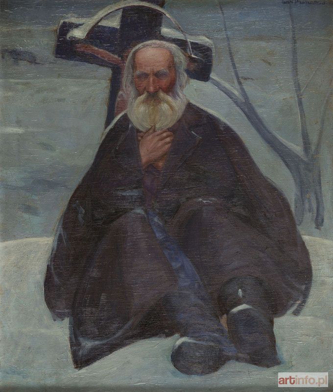 Prezentowany obraz pochodzi z wczesnej, młodopolskiej fazy twórczości artysty. Prace Pronaszki powstałe przed I wojną światową, co dobrze widać na "Starcu pod przydrożnym krzyżem", łączą stylistyczne pokrewieństwa z malarstwem Wlastimila Hofmana i Jacka Malczewskiego. Z pierwszym z nich Pronaszko zetknął się jeszcze jako nastolatek. Hofman często spędzał letnie wakacje w Derebczynie na Podolu, w majątku, w którym wychowywał się młody Pronaszko. Z Malczewskim i jego symbolistyczną sztuką artysta zetknął się po przeprowadzce do Krakowa w 1906 roku. "Starzec pod przydrożnym krzyżem" pokazuje, co artysta zaczerpnął od obu mistrzów. Zarówno ikonografia, jak i stylistyka obrazu wyrastają z krakowskiej formuły modernizmu. Motyw wiejskiego starca czy żebraka pojawia się około roku 1900 w tym środowisku artystycznym często. Przez krytykę kompozycje te byłe zazwyczaj interpretowane w kontekście eschatologicznym. Wiadomo, że Andrzej Pronaszko o studiach artystycznych myślał już w 1905 roku. Za namową ojca w 1906 roku rozpoczął jednak edukację w Wyższej Szkole Przemysłowej w Krakowie. Wiemy, że w tym okresie pracował nad niezachowaną symbolistyczną kompozycją "Sąd Ostateczny", którą około 1908 roku, niezadowolony z efektu, zniszczył. Pronaszko przeniósł się na krakowską Akademię Sztuk Pięknych dopiero w 1909 roku. Studiował w pracowniach Leona Wyczółkowskiego i Stanisława Dębickiego. Zniechęcony atmosferą konserwatyzmu porzucił jednak akademickie studia malarskie. W okresie międzywojennym związał się z formistami. Uważany jest współcześnie za jednego z najwybitniejszych polskich scenografów.