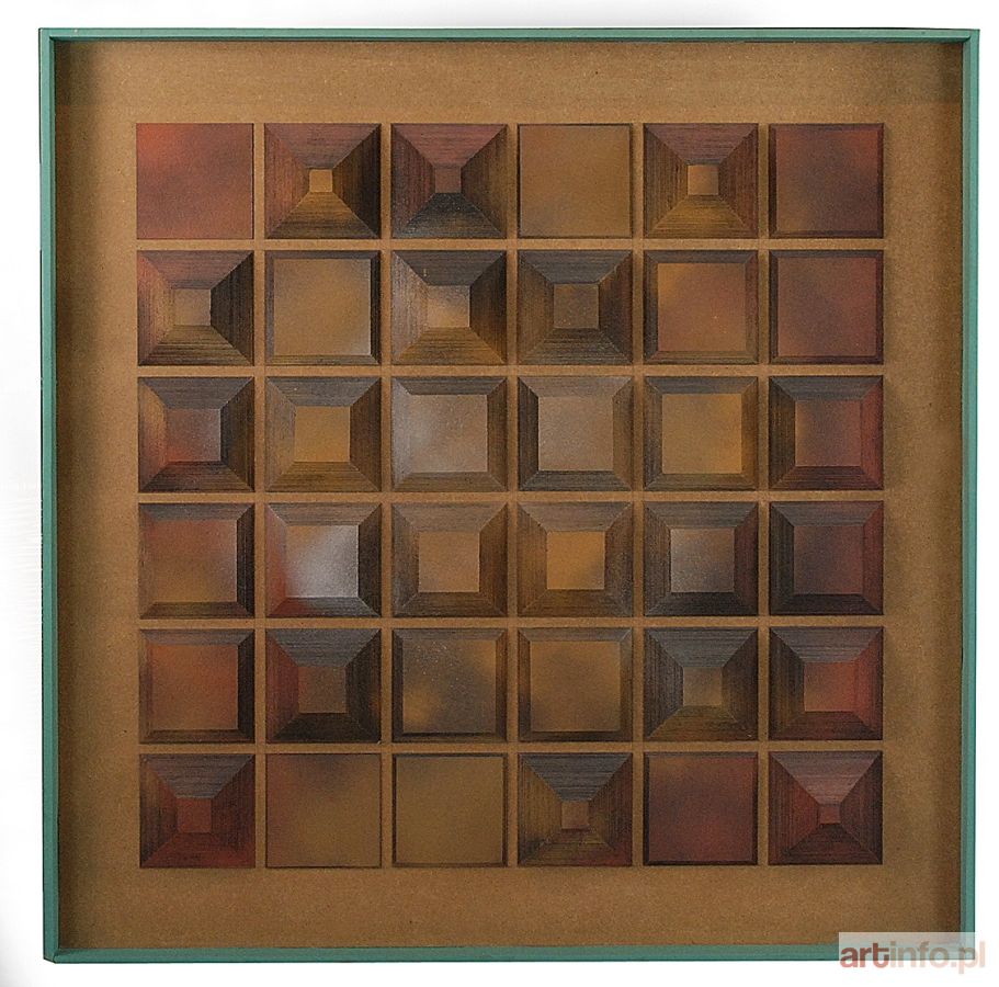 kompozycja przestrzenna, elementy kartonu na płycie; 102 x 102 x 8 cm (wymiar w skrzynkowej oprawie); na odwrocie napis autorski: KWADRAT SŁOŃCA / LEWY / ANDRZEJ URBANOWICZ / 2001 oraz nalepki inwentarzowe.