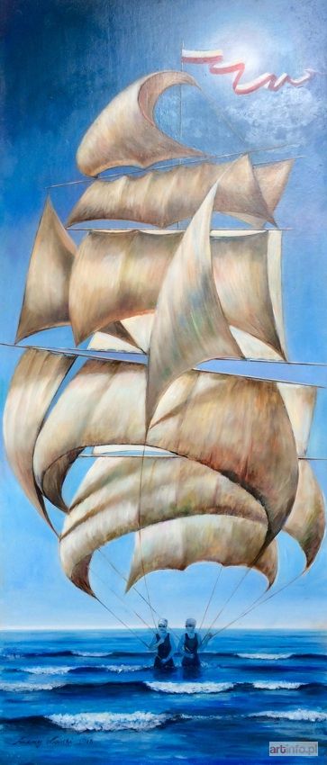 olej na płótnie, 120 x 52 cm Sygnowany l. d. róg: ‘Andrzej Wroński 2018’ Opisany na odwrocie: ‘"POKONAĆ BAŁTYK" 2018 OLEJ, PŁÓTNO 120 x 52 Andrzej Wroński’