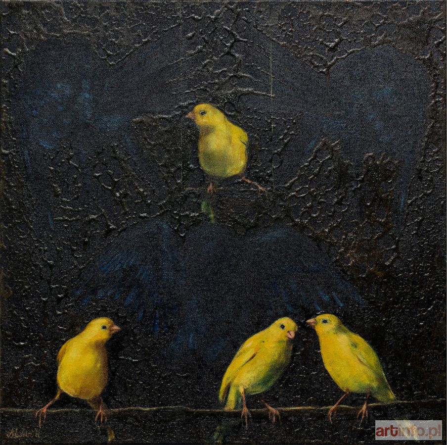olej, płótno, 50x50 cm sygn. l.d.: monogramem, opisany na odwrocie: "Martwa natura z zazdrosnymi kanarkami" olej na płótnie, 50x50 cm, 2012 r. Angelika Milaniuk-Mitruk