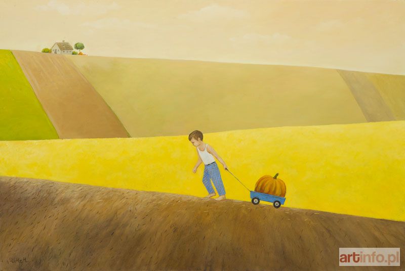 olej/płótno 80 x 120 cm sygnowany l.d.: 'AMitruk' na odwrociu opisany: ' "Jesienne zbiory" z cyklu "Śniło mi się", olej na płótnie, 80 x 120 cm, 2015 r. | "Autumn harvest'' from cycle "I had a dream", oil on canvas, 80 x 120 cm, 2015'