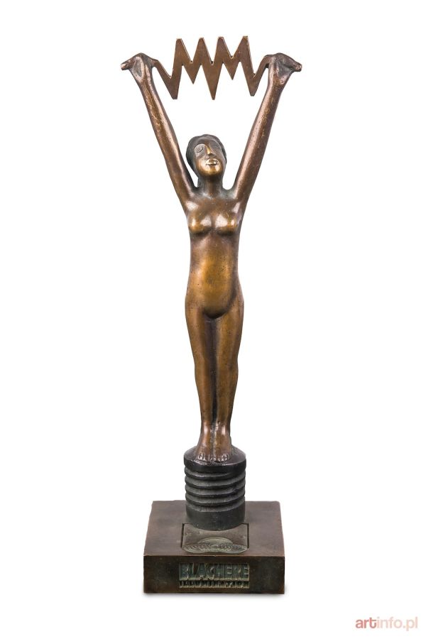 wymiary: wys. 34 cm, szer. podstawy: 9 cm sygnowana z tyłu "Andrzej Wrona" na podstawie napis SAPERE BLACHERA ILLUMINATION