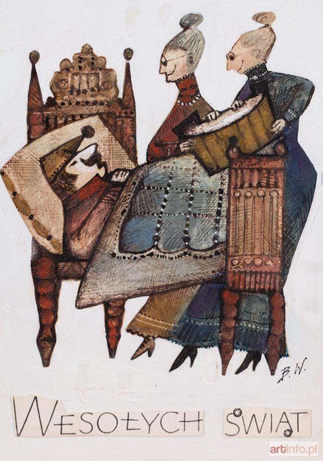 akwarela, gwasz, kolaż, tusz/papier, 15 x 10,5 cm (arkusz) sygnowany p.d. 'B.W.'