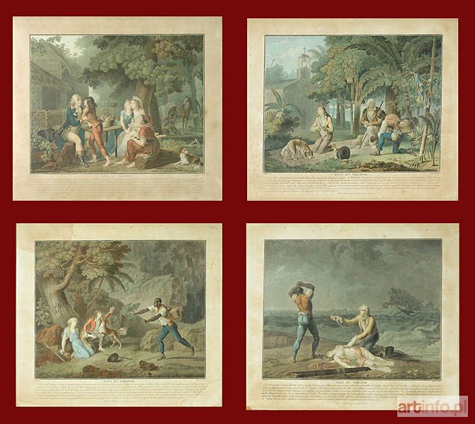 Poniżej ryciny francuski opis obrazów, u dołu nazwa wydawcy: AParis chez Descurtis. Ryciny w drewnianych, profilowanych ramach z nałożonymi, narożnymi rozetami z brązu