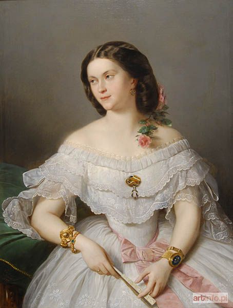 Cosroe Dusi włoski malarz, ilustrator i grafik związany był z dwoma ośrodkami sztuki Wenecją i Petersburgiem. W latach 1820-1827 studiował w weneckiej Accademia di Belle Arti w pracowni Teodora Matteiniego. W początkowym okresie działalności wykonywał głównie portrety i kompozycje historyczno-religijne. W weneckich kościołach S. Martino, S. Giovanni in Bragora do dzisiaj znajdują się jego dzieła. Wykonał też wiele kompozycji religijnych do kościołów na terenie Południowego Tyrolu: Graun, Maria Luggau, Mühlwald, Pfalzen. W 1839 roku poznał następcę tronu rosyjskiego i rok później udał się do Petersburga. Szybko otrzymał stanowisko malarza nadwornego, w 1842 tytuł akademika, a w 1851 profesora malarstwa historycznego. W Rosji podejmował się różnorodnych zleceń, malował portrety, sceny historyczne, nawet pejzaże. Jest też autorem dzieł religijnych do ikonostasu w soborze Św. Izaaka i kaplicy w pałacu Marmurowym w Sankt Petersburgu. Wiadomo również, że wykonywał dekoracje dla Teatru Balszoj w Moskwie oraz dla Teatrów Aleksandryjskiego i Michajłowskiego w Petersburgu. Do dzisiaj zachowały się wykonane przez niego malowidła w Ermitażu. W 1856 roku powrócił do Wenecji i objął stanowisko profesora tamtejszej akademii. W 1858 roku ponownie wyprawił się do Sankt Petersburga, przejazdem zatrzymał się w Warszawie. Z powodu ciężkiej choroby szybko opuścił Rosję i wyjechał do rodzinnego miasta. Zmarł w miejscowości Marostica, okolice Vicenzy. Niniejszy portret wykonany w 1858 roku przedstawia piękną młodą kobietę w wytwornej białej sukni z wachlarzem w ręku. Obraz powstał prawdopodobnie podczas krótkiego pobytu w Rosji w tym samym roku, albo we Włoszech, zaraz po powrocie artysty i wiąże się ze zleceniem, które wcześniej otrzymał w Petersburgu. Bogactwo stroju i biżuterii sugerują, że przedstawiona osoba należała do zamożnej arystokracji lub burżuazji, częstych modeli Dusiego. Obraz wyróżnia się mistrzostwem wykonana, nawiązuje do najwyższej klasy europejskich portretów połowy XIX stulecia. W polskich zbiorach jest to bardzo rzadki przykład, tak znakomitego włoskiego malarstwa ottocenta.