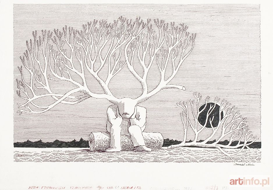 cienkopis, karton; 26 x 37 cm (wymiar arkusza); sygn. p. d.: Daniel Mróz; poniżej opis: KERN: ETYMOLOGIA (...) CTR 51 SKALA 1:2 POGLĄDANIE ... 1972 1152/7 182; ilustracja do tomiku L. J. Kerna Podglądanie rodaków, WL 1972.