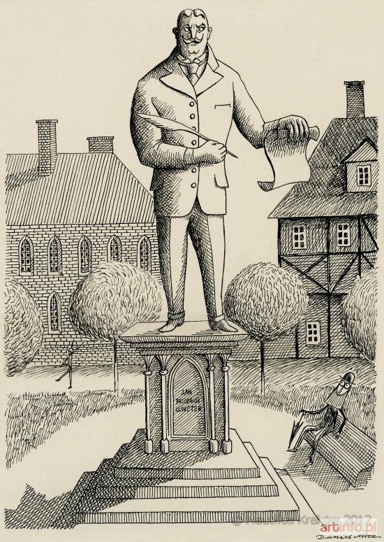 Piórko, tusz, papier; wym.: 20,7 x 15 cm; sygn. p.d.: Daniel Mróz. Ilustracja do opowiadania "Złote myśli" z książki Jerzego Szaniawskiego "Profesor Tutka" (Wydawnictwo Literackie, Kraków 1956). Lit.: "Daniel Mróz", katalog wystawy, Galeria Starmach, Kraków 2010, s. 32.