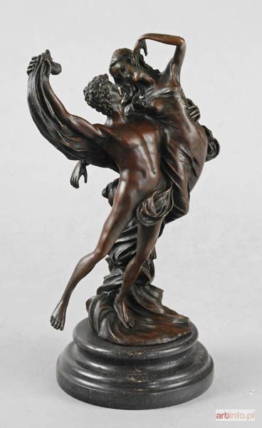 rzeźba na kolistym cokoliku z szarego, toczonego marmuru; brąz, odlew patynowany; marmur; wys. ca 27 cm, szer. ca 16 cm; średnica cokołu 12 cm. Francja, k. XIX w. - odlew współczesny.