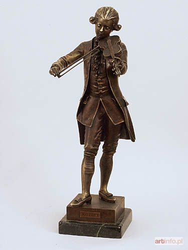 brąz, cokół z zielonego marmuru; wys. 53 cm; sygn. na podstawie: Debut Całopostaciowa rzeźba młodocianego, grającego na skrzypcach Wolfganga Amadeusza Mozarta. Koniec XIX/XX w.