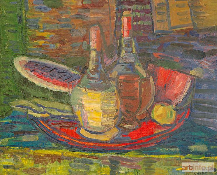 olej, płótno, 60,5 x 73 cm; sygn. p.d.: burke; na odwrocie napisy autorskie: BURKE EDMUND / MARTWA NATURA z ARBUZAMI oraz data 1967 oraz nalepka Warexpo z nazwiskiem autora, tyt. obrazu techniką i wym.
