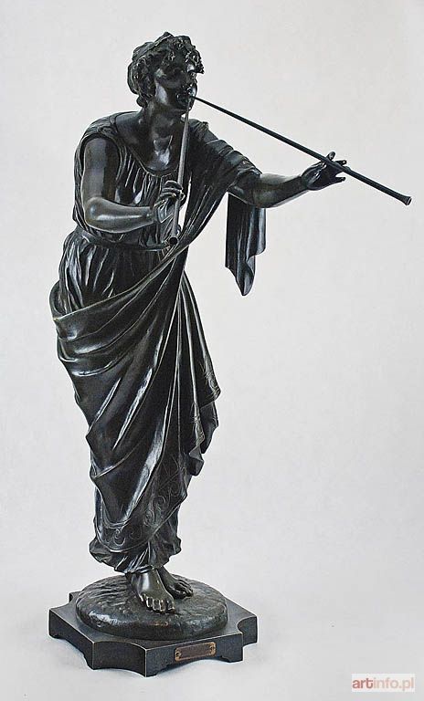 brąz patynowany na czarno, wys. 83 cm; sygn. na podstawie: Drouot, od frontu tabliczka z napisem JOUEUSE DE PIPLAUX Par Drouot. Medaille aux Beaux-Arts. Stojąca, lekko pochylona do przodu postać młodej Greczynki, odzianej w peplos i chiton, grającej jednocześnie na dwóch piszczałkach przytrzymywanych w wyciągniętych do przodu rękach.