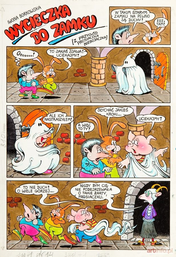 plansza komiksowa do czasopisma Świerszczyk nr 1, s.14 akwarela, tusz/papier, 38 x 26 cm sygnowany l.d.: `rys. E. Lutczyn`