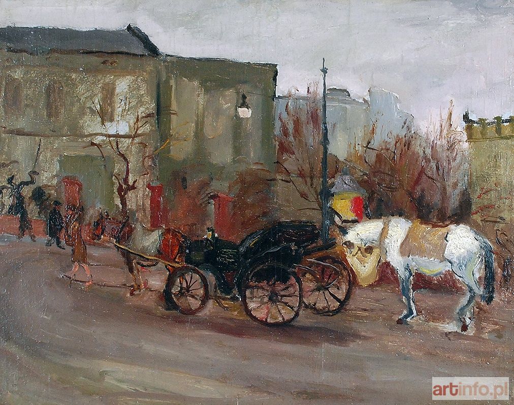 olej, sklejka; 47,5 x 60 cm; na odwrocie fragment większej kompozycji przedstawiającej akt kobiety oraz odręczny napis: Matuszczak / "Fiakry" (ołówkiem).