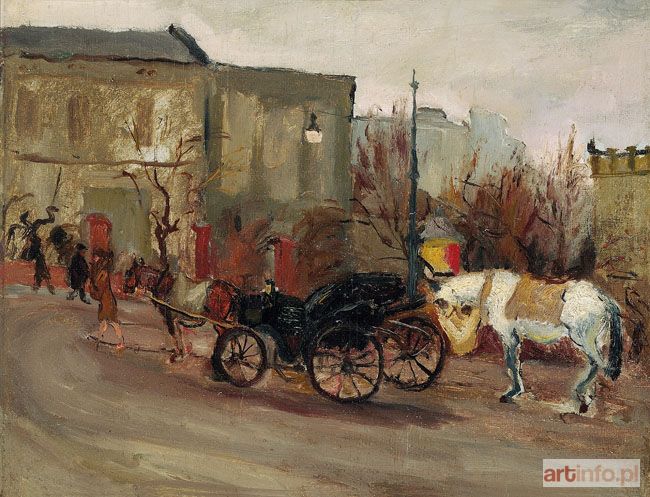 olej na sklejce, 47,2 x 60 cm, na odwrocie fragment innej kompozycji oraz napis o treści: Matuszczak /"Fiakry"