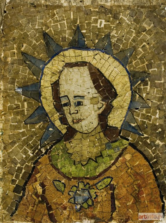 Mozaika; 24,5 x 19,3 cm Na odwrocie nalepka Towarzystwa Przyjaciół Sztuk Pięknych w Krakowie, wypełniona czarnym atramentem: R. 1935 | kwiecień maj | Nr 917/401/ | Autor Edward Matuszczak | Adres Kr. | Dzieło Madonna II | Wykonanie mozajka | cena Praca wystawiana w TPSP w Krakowie w roku 1935.