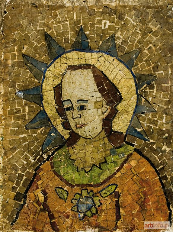 Mozaika; 24,5 x 19,3 cm Na odwrocie nalepka Towarzystwa Przyjaciół Sztuk Pięknych w Krakowie, wypełniona czarnym atramentem: R. 1935 | kwiecień maj | Nr 917/401/ | Autor Edward Matuszczak | Adres Kr. | Dzieło Madonna II | Wykonanie mozajka | cena