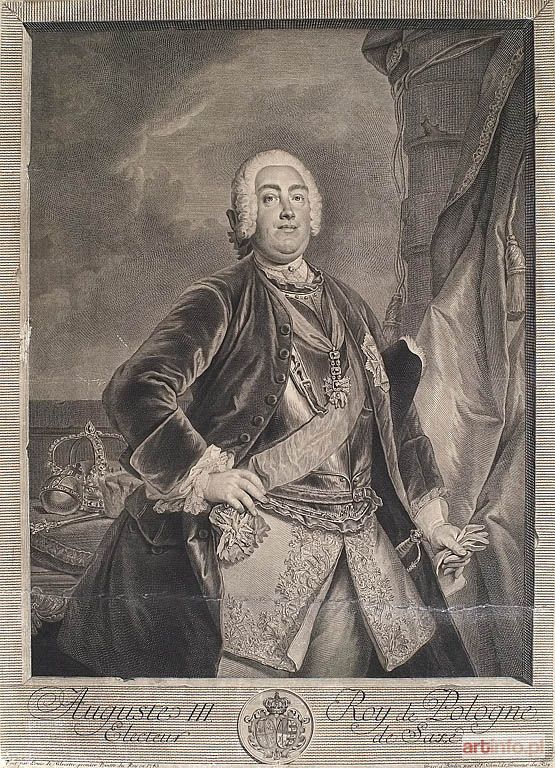 miedzioryt według obrazu Louisa Silvestrea, na papierze; wym.: 510 x 365 mm; sygn. pod ryciną: Peint par Louis de Silvestre, premiere Peintre du Roy en 1743; z p.: Gravé a Berlin par G.F. Schmidt, Graveur du Roy. Stan zachowania: niezachowane odbicie płyty, grafika obcięta, zdublowana (stara konserwacja), w dolnej części ślad przedarcia planszy.