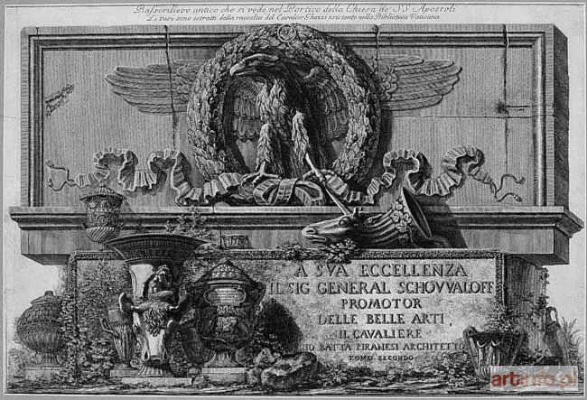 miedzioryt i akwaforta, 47 x 70 cm w świetle passe-partout karta tytułowa t. II dedykowana gen. Szuwałowowi i ks. Golicynowi. sygnowany: "Cavalier. Piranesi del. et inc.", "G. B. Piranesi" oraz "Gio Batta Piranesi Architette"