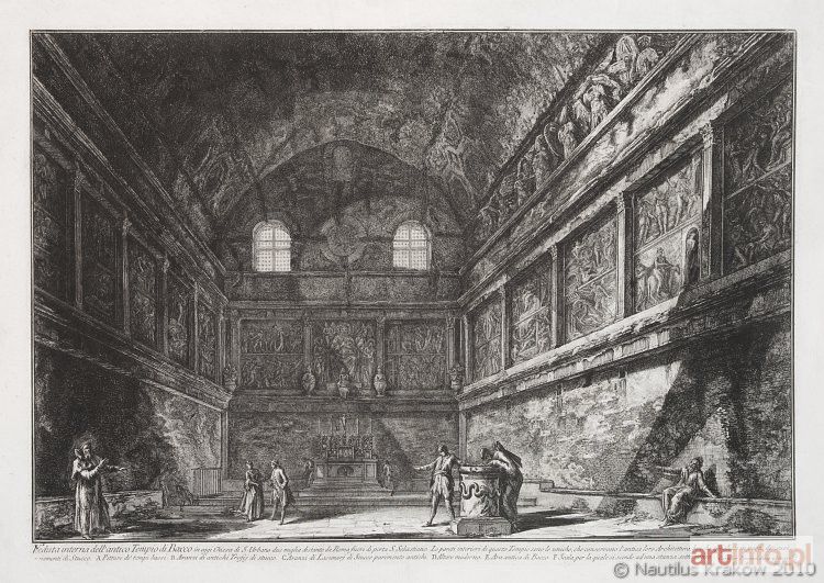 Akwaforta, papier żeberkowy; wym.: 405 x 600 mm; opisana i sygnowana u dołu na płycie: Veduta interna dell`antico Tempio di Bacco in oggi Chiesa di S. Urbano due miglia distante da Roma fuori di porta S. Sebastiano. Grafika z cyklu Vedute di Roma, 1748-1778. Lit.: L. Ficacci, ?Piranesi. The Complete Etchings", Taschen 2000, poz. 952, po konserwacji.