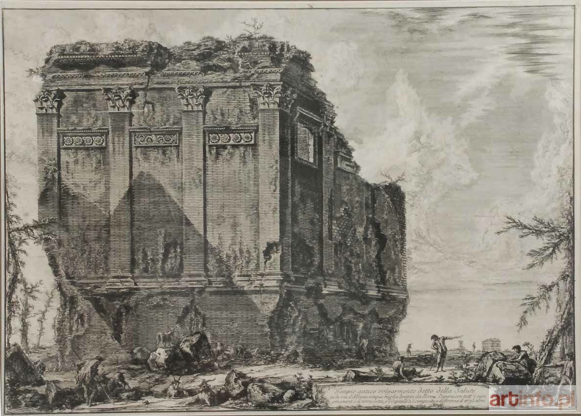 miedzioryt, papier; 41,3 x 56 cm (w świetle oprawy); sygn. pod kompozycją l. d.: Piranesi F (ecit). Przedstawienie rzymskiej ruiny w okolicach Rzymu. Oryginalna praca jednego z najwybitniejszych grafików XVIII w. Piranesi studiował w Wenecji, skąd podróżował w celach naukowych do Neapolu, Herkulanum i Pompei. Europy. Praca oprawiona w złoconą ramę