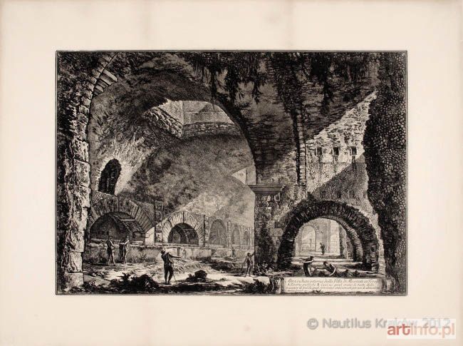 Akwaforta na grubym papierze; wym.: 420 x 600 mm; sygn. pł. w kartuszu: Cavalier Piranesi inc. Plansza z cyklu "Vedute di Roma". Dekoracyjna grafika; odbitka z początku XX w., ale z oryginalnej płyty.