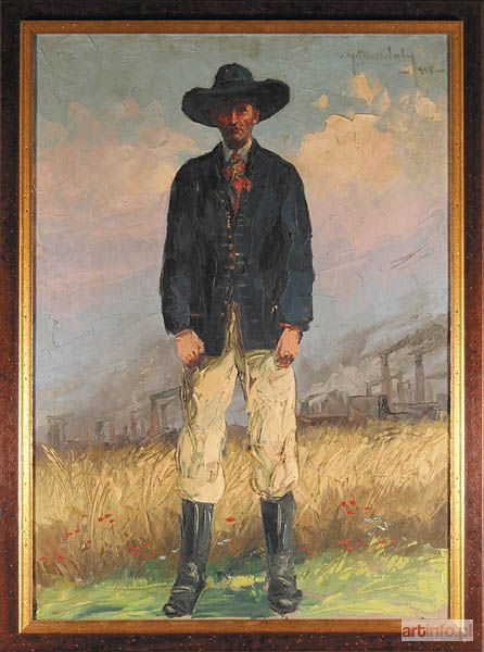 olej/płótno 93 x 67,5 cm sygnowany i datowany p. g.: `G Mendoly | -935-` na odwrocie napis: `TIP | SZLONSKI | ober Schlesia | 1935` oraz papierowa naklejka: `od 27 października do 27 listopada br | BUŁGARSKA | WYSTAWA | ORAZÓW | prof. Stefanowa G. Mendoly`ego | z Sofji | przy ul. Piotrkowskiej 150 I p front | Prace wykonane głównie szpachlą; | portrety, typy słowiańskie i krajobrazy | Wejście 25 groszy | Wystawa otwarta codziennie od 10 rana do 20 | Druk Rydlewski Nakład własny`