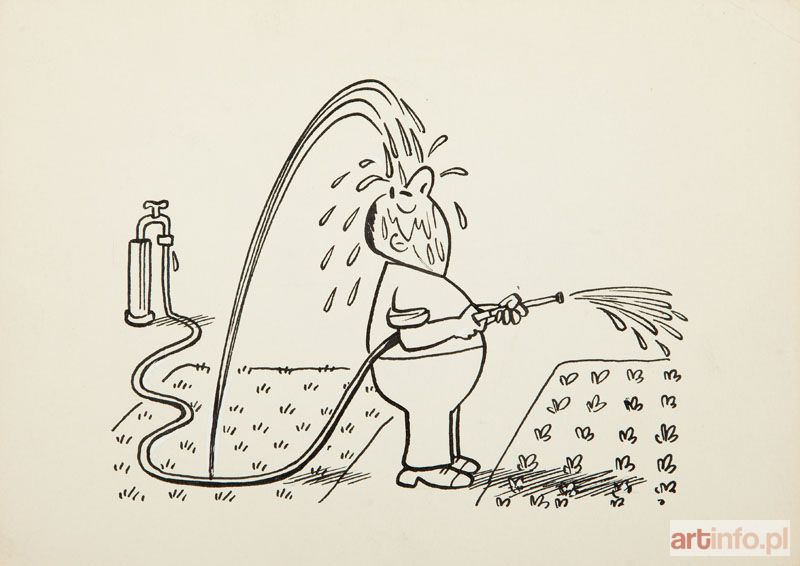 - ciekawe, gdy tylko zaczynam podlewać ogródek - zaraz zaczyna padać deszcz!.. - ilustracja satyryczna do Tygodnika Polskiego,