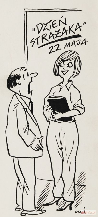 do "Tygodnika Polskiego", lata 80. XX w. tusz, papier; 21,5 x 10 cm; napis p. g.: "DZIEŃ / STRAŻAKA" / 22 MAJA sygn. p. d.: mi; na odwrociu odręczny napis: Gwidon Miklaszewski/ NASZA SYRENKA Foto straszne, proszę pani! Nazywam się Józef Ogień i gdy tylko odezwę się w telefonie ` Halo tu Ogień ` - to za 5 minut mam w mieszkaniu straż pożarną ! pośrodku w owalu napis czerwonym flamastrem: na piątek / 20 maja Dzień strażaka