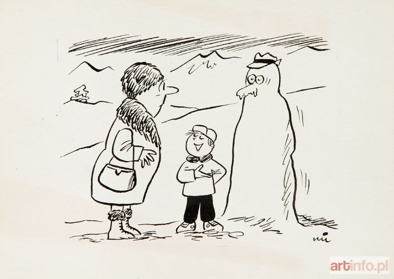tusz/papier 16 x 23 cm sygnowany p.d.: `mi` na odwrociu pieczęć czasopisma `Tygodnik Polski` oraz opisany: `Tytuł: Gwidon Miklaszewski | Z bałwankiem śniegowym | w Zakopanem!`