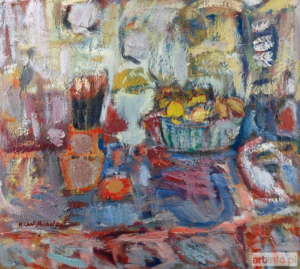 olej, płótno; 62 x 70 cm; sygn. l. d.: H.Cent-Michalska na odwrocie opis: "W PRACOWNI / 1988 rok / OLEJ 62 x 70, oraz opis na blejtramie: R. 1988 HALINA CENTKIEWICZ-MICHALSKA (zamazany tytuł) OLEJ 62 x 70