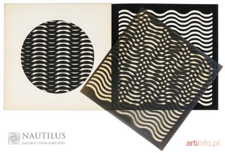 "Mechano-fakturen von Henryk Berlewi. Situationen 60 galerie dokumentation b 1-63", Berlin 1963; wydawnictwo artystyczne; wym.: 22 x 22 cm; dwie składane, trójelementowe plansze z serigrafiami [wym.: 22 x 66 cm] oraz jedna plansza z kompozycją na folii [22 x 22 cm]. Stan bardzo dobry.