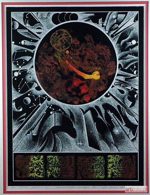 cynkografia, monotypia, papier, 67 x 50,5 cm (w świetle oprawy); sygn. i opisany ołówkiem u dołu: "Dla Miles`a Davis`a" 1/1. autocynkografia - monotypia 1999 (A.P.) Henryk Płóciennik