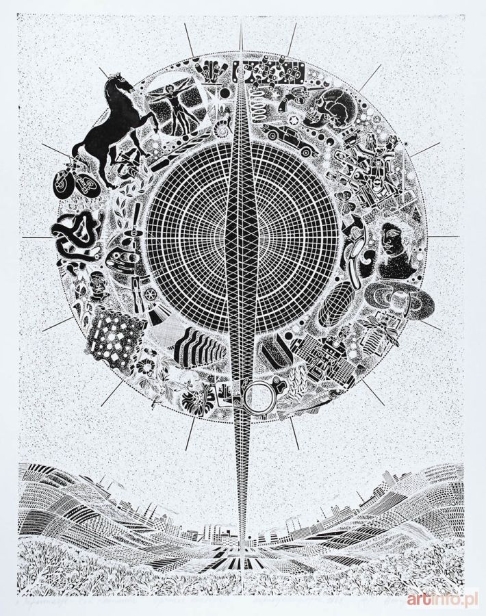 autocynkografia, papier; 64,5 x 49,5 cm (wymiar kompozycji), 80 x 60 cm (wymiar arkusza); sygn., dat. i opis u dołu ołówkiem: Informacje - Koń Leonarda epreuve d`artiste autocynkografia 1969 (A.P.) Henryk Płóciennik