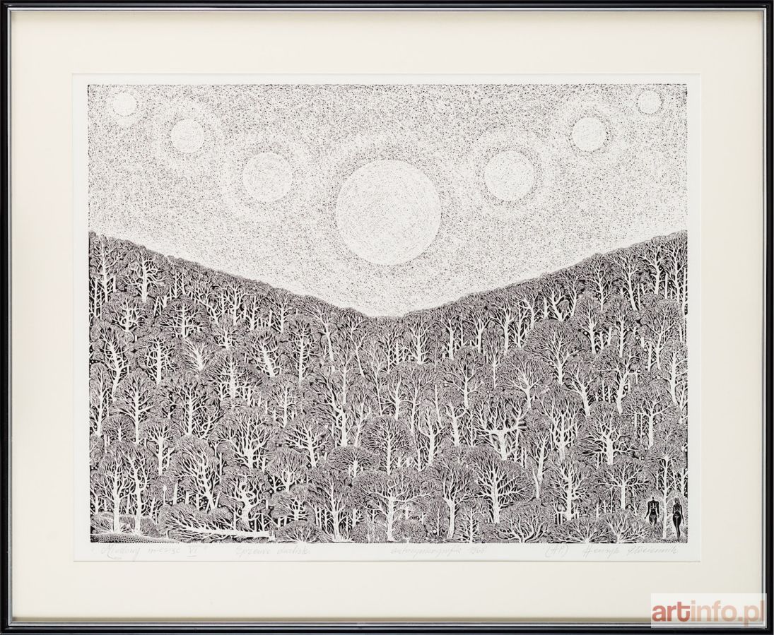 autocynkografia/papier, 63 x 77 cm sygn. p.d.: „(H.P.) Henryk Płóciennik oraz opisany l.d.: „”Miodowy miesiąc VI” Epreuve d’artiste. autocynkografia 1968”