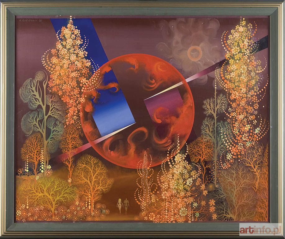olej/płótno, 65 x 81 cm sygn. i dat. l.g.: `H. PŁÓCIENNIK 76`, opisany na odwrocie: `HENRYK PŁÓCIENNIK 1976 R. / "OGRÓD CZERWONY" OLEJ 65 x 81 cm`