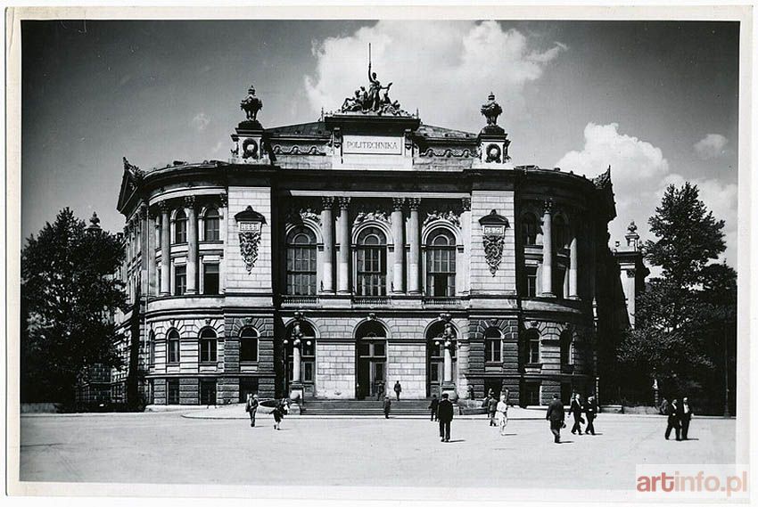 przed 1939 r. 11,7 x 17,5 cm Front Politechniki Warszawskiej przed II wojna światową. na odwrocie pieczątka: `REPRODUKCJA PRAWNIE ZASTRZEŻONA` oraz napis atramentem: `Politechnika Warszawska 1939 r. | C. B. J. Fot. Poddębski` odbitka z epoki