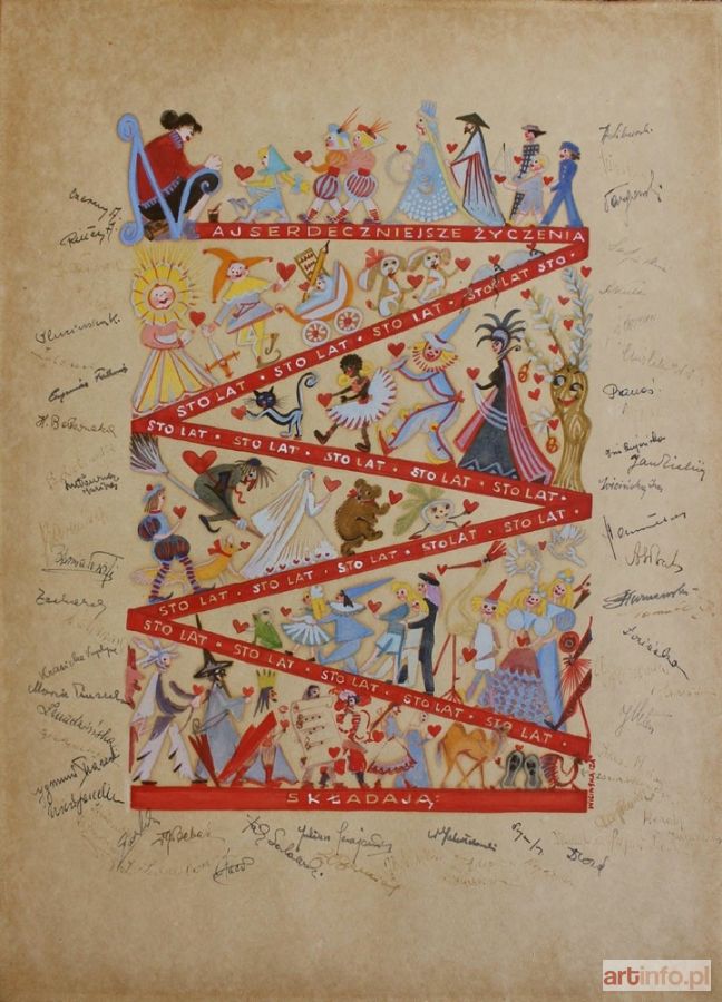 (karta z życzeniami i autografami aktorów i pracowników teatru w Krakowie, na odwrociu dedykacja: Wszystkie postaci z bajki składają życzenia "Pani Marysi Bajczarce") sygn. p.d. gwasz, papier 47x34 cm