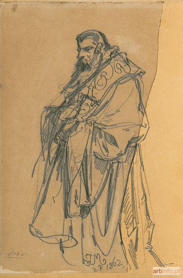 ołówek, papier, 22.2 x 14.7 ołówek, papier naklejony na cienką tekturę (po prawej stronie oddarta część papierowej karty, a rysunek uzupełniony już na tekturze) sygn. monogramem wiązanym u dołu pośrodku: JM | z P. 1862 napis l.d.: Doża
