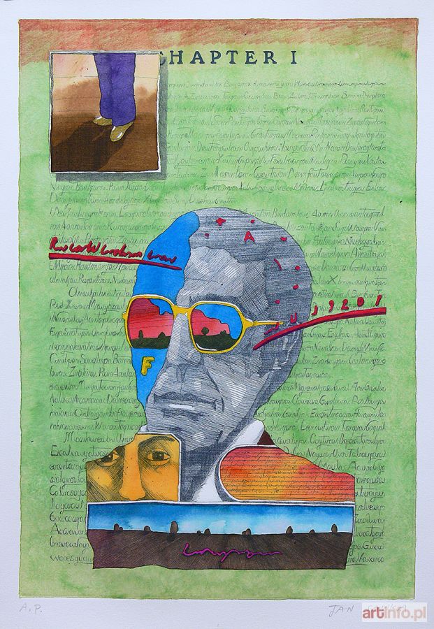 akwaforta, sucha igła, akwarela, 54 × 38 cm sygn. ołówkiem p. d.: JAN SAWKA, l. d.: A.P. [Artist Proof] projekt strony do książki „A book of fiction”, jedna z 25 plansz, Nowy Jork 1986