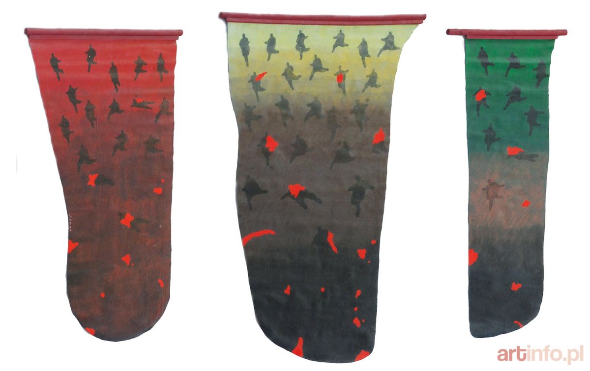 technika mieszana, akryl, płótno o nieregularnym kształcie, drewniana listwa; 148 x 88 cm - sygn. przy krawędzi SAWKA (część lewa), 177 x 127 cm (część środkowa), 166 x 53,5 cm (część prawa)