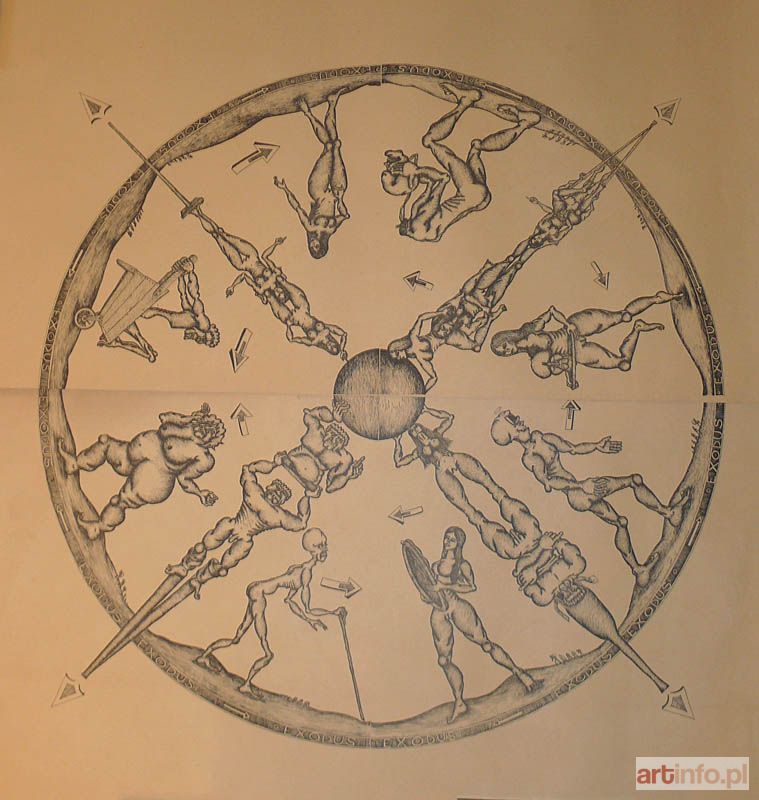 (1974). Linoryt na papierze. 2 plansze o wym. 100 x 70 cm i 100 x 66 cm. Niew naddarcia marginesów. Plakat składa się z dwóch części. Oferowana grafika jest projektem plakatu do spektaklu "Exodus", w Teatrze STU w Krakowie, w 1974. Jan Sawka (1946 - 2012), polski grafik, rysownik, malarz, architekt.